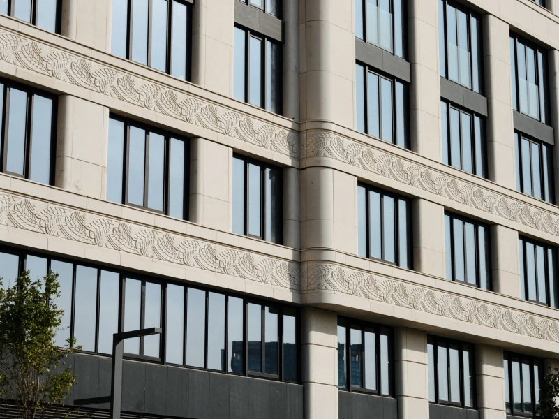 - Элегантная фасадная отделка из натурального камня с изысканными резными деталями. Просторные двухсторонние входные группы с уникальным дизайном в каждом здании.