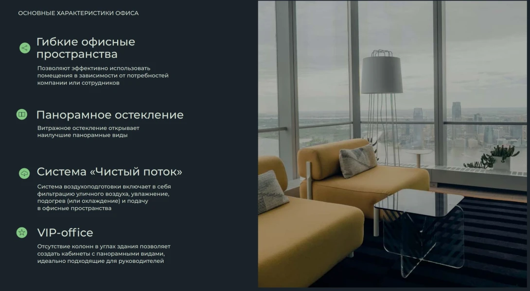 Отсутствие колонн в углах здания позволяет создать кабинеты с панорамными видами, подходящие для руководителей