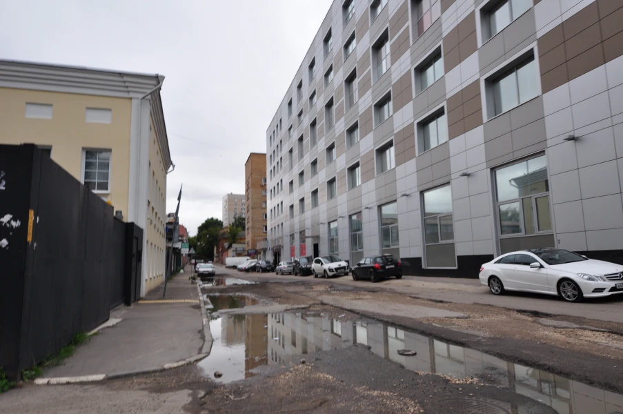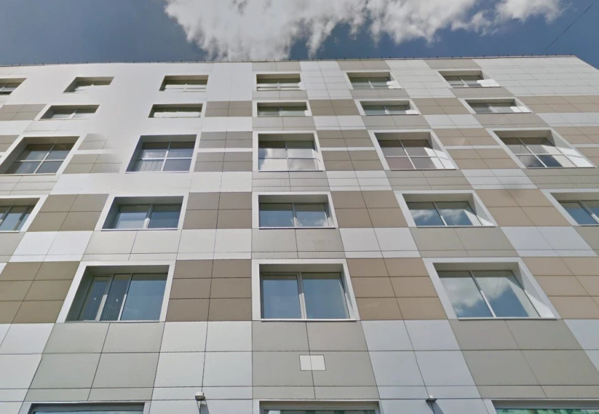 Фасад небольшого коммерческого здания, построенного по панельной технологии, выполнен в серых и темно-коричневых тоннах. Въезд на территорию объекта ограничен и осуществляется через шлагбаум.