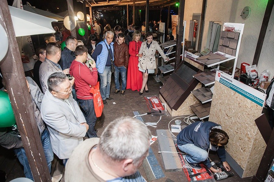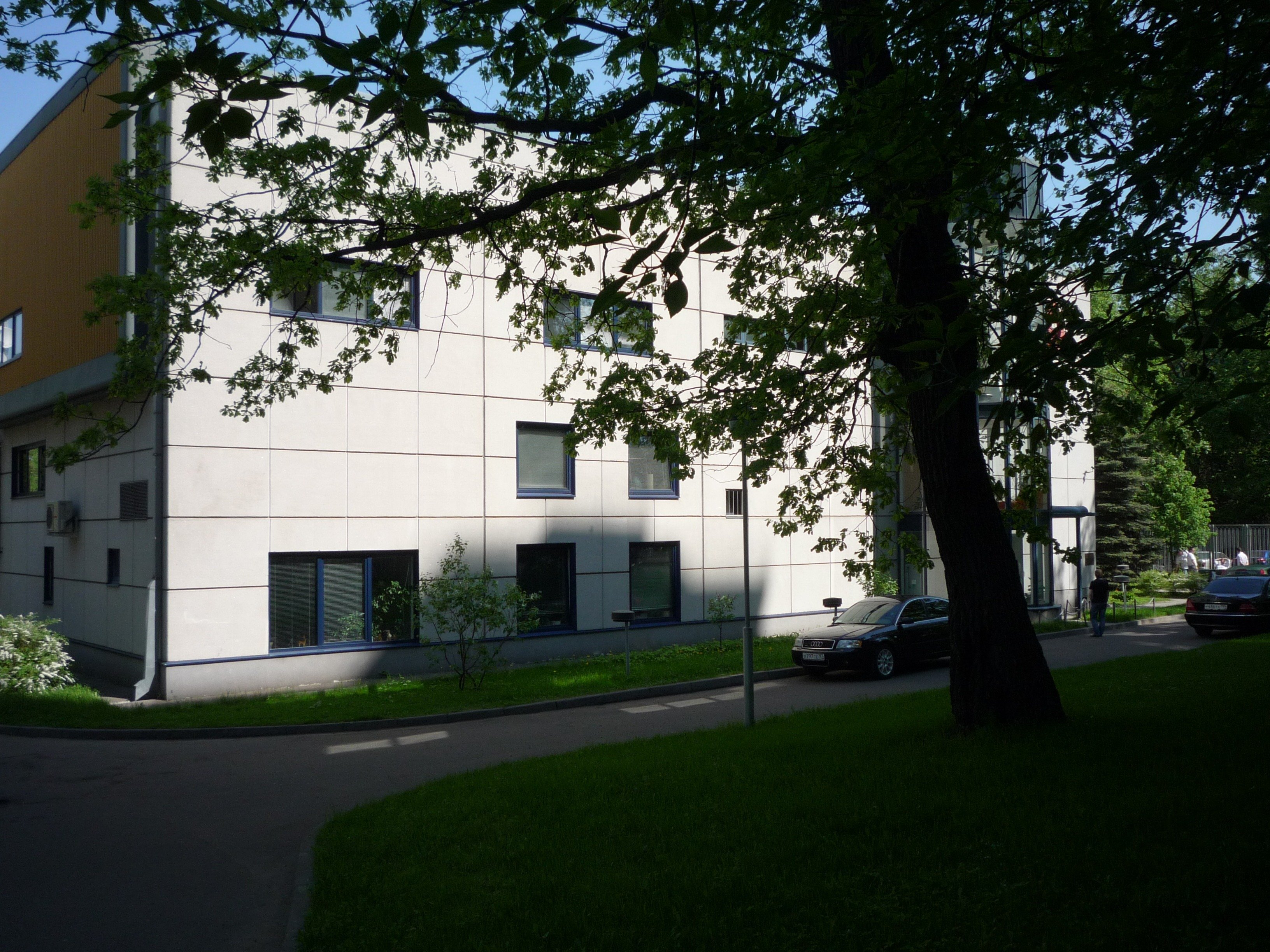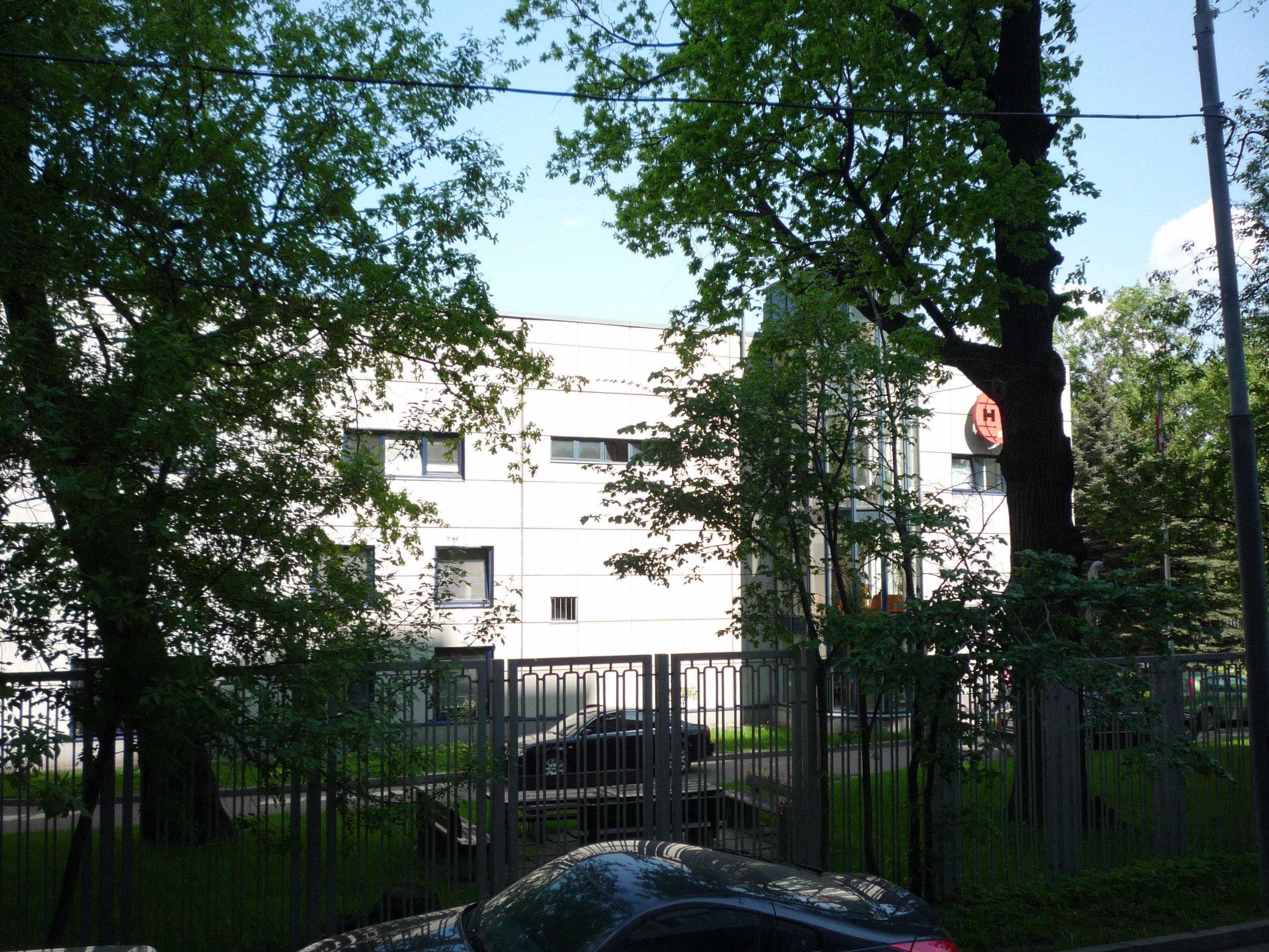Территория делового центра радует глаз ухоженной зеленой лужайкой, клумбами и небольшим искусственным прудом, где гордо стоит статуэтка розового фламинго. Уникальности фасаду здания придают панорамные окна эркера, в котором располагается уютная зона отдыха с бежевыми кожаными диванами, журнальным столиком и множеством пышных комнатных растений.