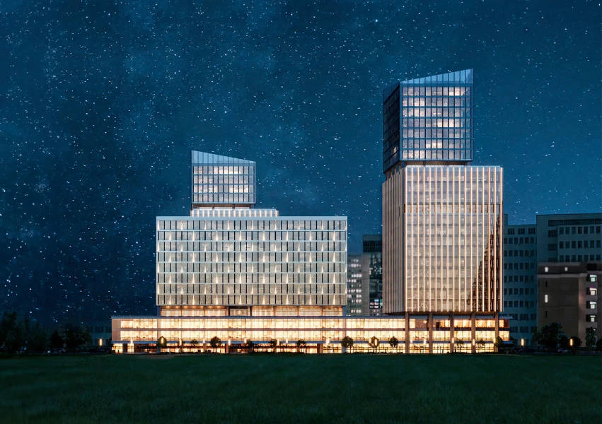 Архитектура от бюро Kleinewelt Architekten. Три офисные башни общей площадью 83 тыс. кв. м с динамичным фасадом станут новой архитектурной доминантой района.