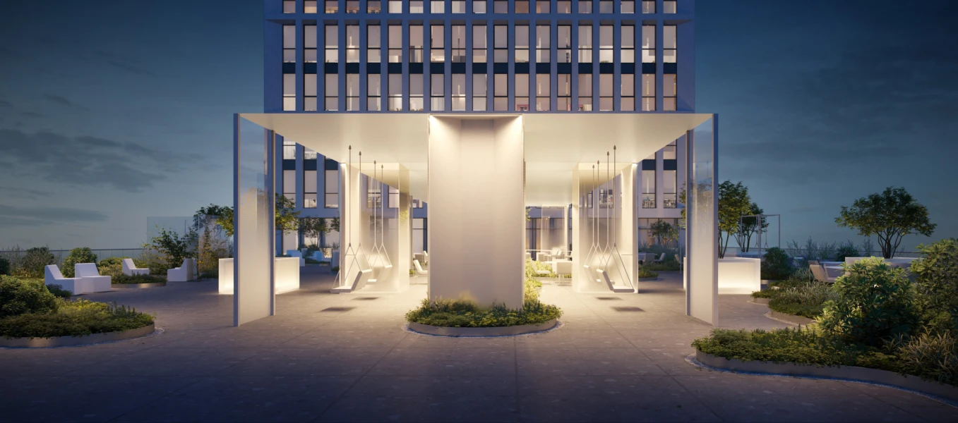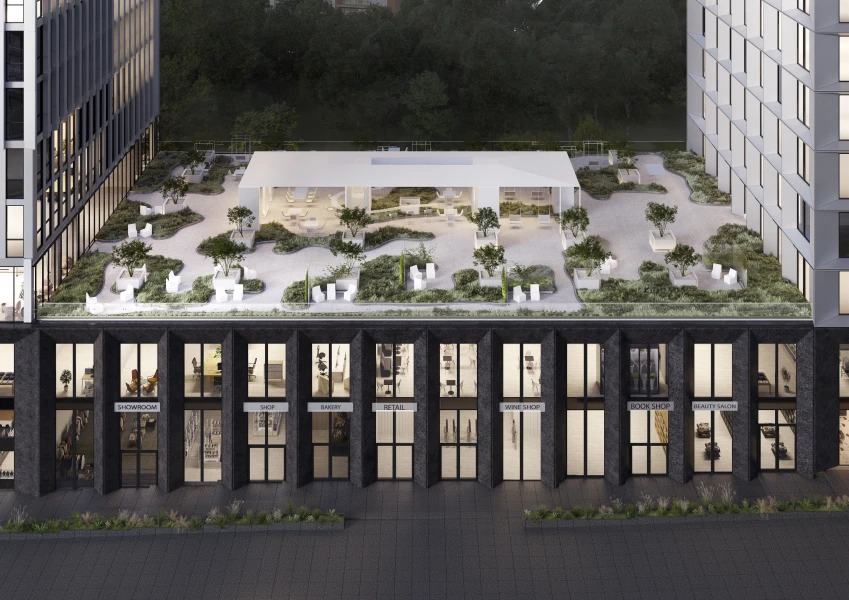 Благоустройство предполагает зонирование: открытая зеленая лаунж-терраса, где предусмотрены зоны для работы на открытом воздухе, места для отдыха и качели; на уровне земли — летние веранды ресторанов и кафе.