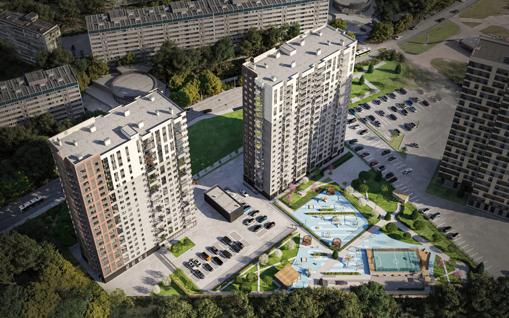 Продуманная инфраструктура наших комплексов — детские площадки, зоны отдыха, безопасные пешеходные зоны, удобные парковки — всё под рукой и создано для вашего удобства.