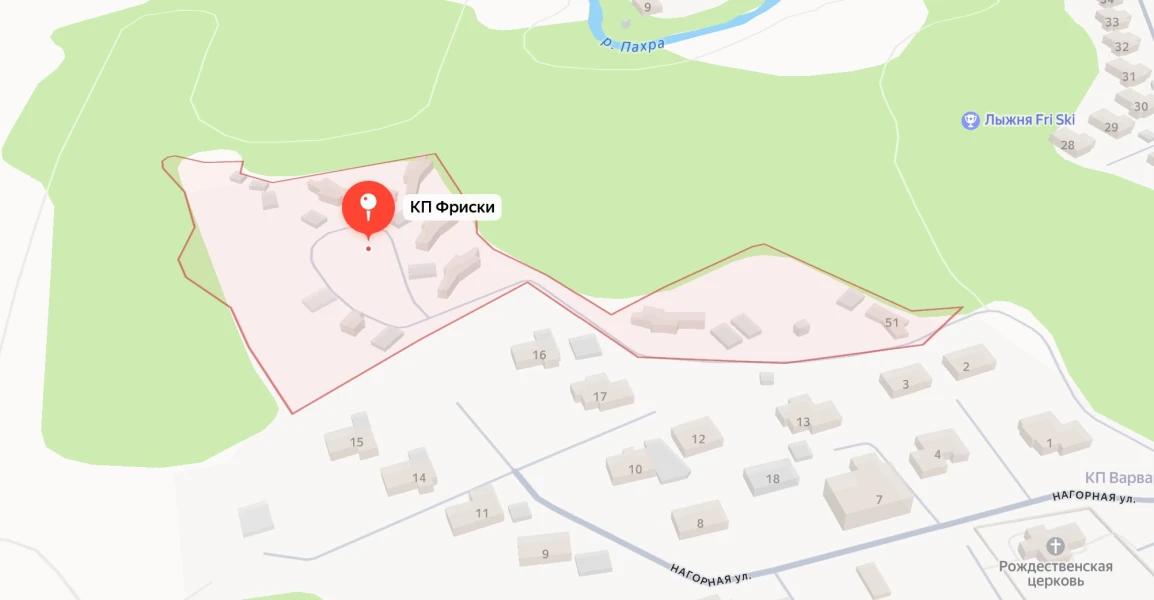 КП FreeSki (ФриСки) расположен в 23 км от МКАД по Калужскому шоссе. Общая площадь поселка составляет 4 га. Лесной массив окружает 12 домовладений с участками от 22,3 соток каждый. На территории проведены все необходимые коммуникации.