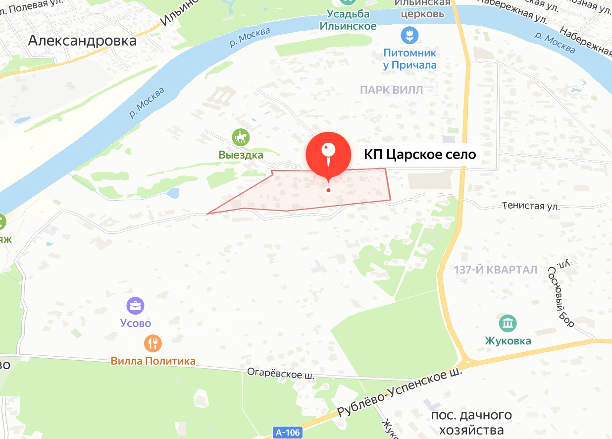 Инфраструктура на территории поселка отсутствует в связи с его камерностью, но прямо за забором есть все, что необходимо для комфортного проживания за городом: Ресторан Чайхона №1, Политика и ресторан Причал; Фитнес центры World Class и Pride;Теннисный центр; Школа и детский сад Президент; река Москва. Ко всем домам сооружениям подведены коммуникации – есть газ, вода, свет, интернет, телефонная связь. По всему периметру поселка предусмотрено ограждение. Также осуществляется круглосуточная охрана и патрулирование.