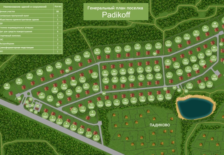 Также к услугам жителей Padikoff насыщенная инфраструктура Новорижского шоссе. В пятиминутной доступности в комплексе NovaRiga, включающий образовательный и медицинский центр, спортивный клуб, торгово-развлекательный комплекс, конноспортивный комплекс, гостиничный комплекс для персонала и аквапарк.
