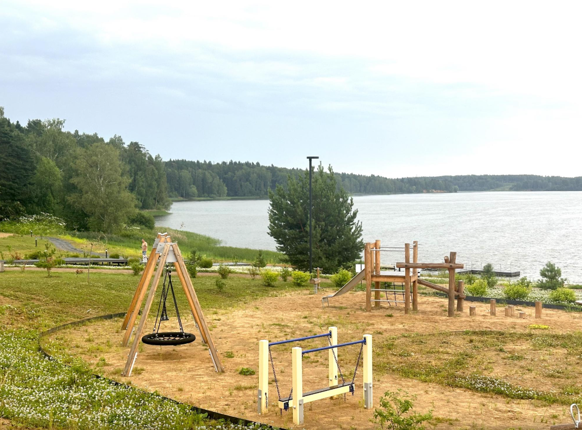 Самое лучшее место вдоль береговой линии отведено под оборудованный пляж, детский игровой городок и зону для спортивных занятий. Здесь есть удобная лодочная станция. Запланированы места для ресторана и шатров отдыха. Разбит небольшой сквер.