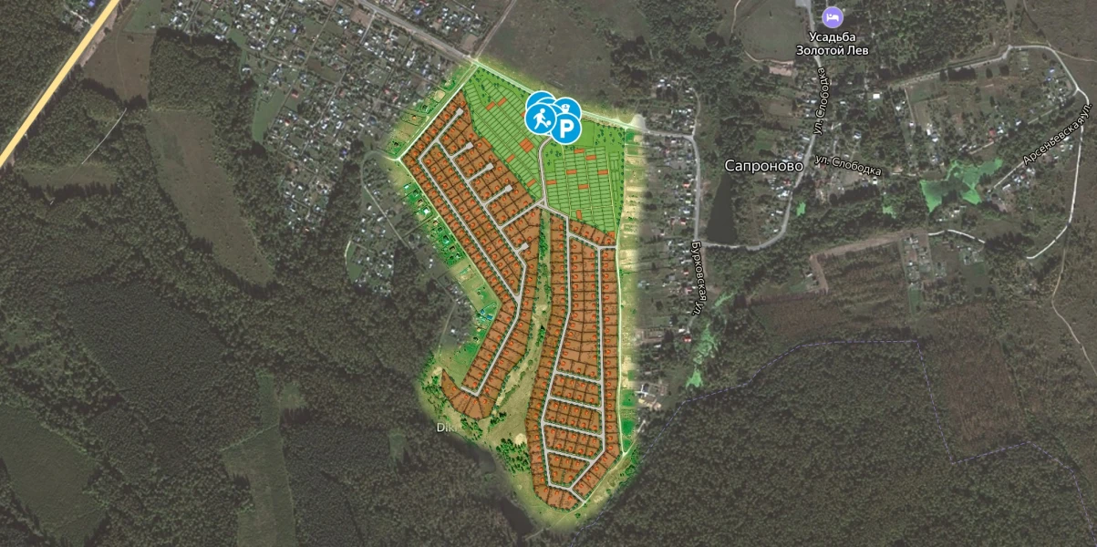 Поселок Сапроново с двух сторон граничит с лесным массивом. Рядом есть два водоема и небольшая речка. В поселке предусмотрены: электричество, дороги внутри поселка, внешнее ограждение, въездная группа, охрана, детский городок с батутом, спортивная площадка, зона отдыха, минизоопарк.