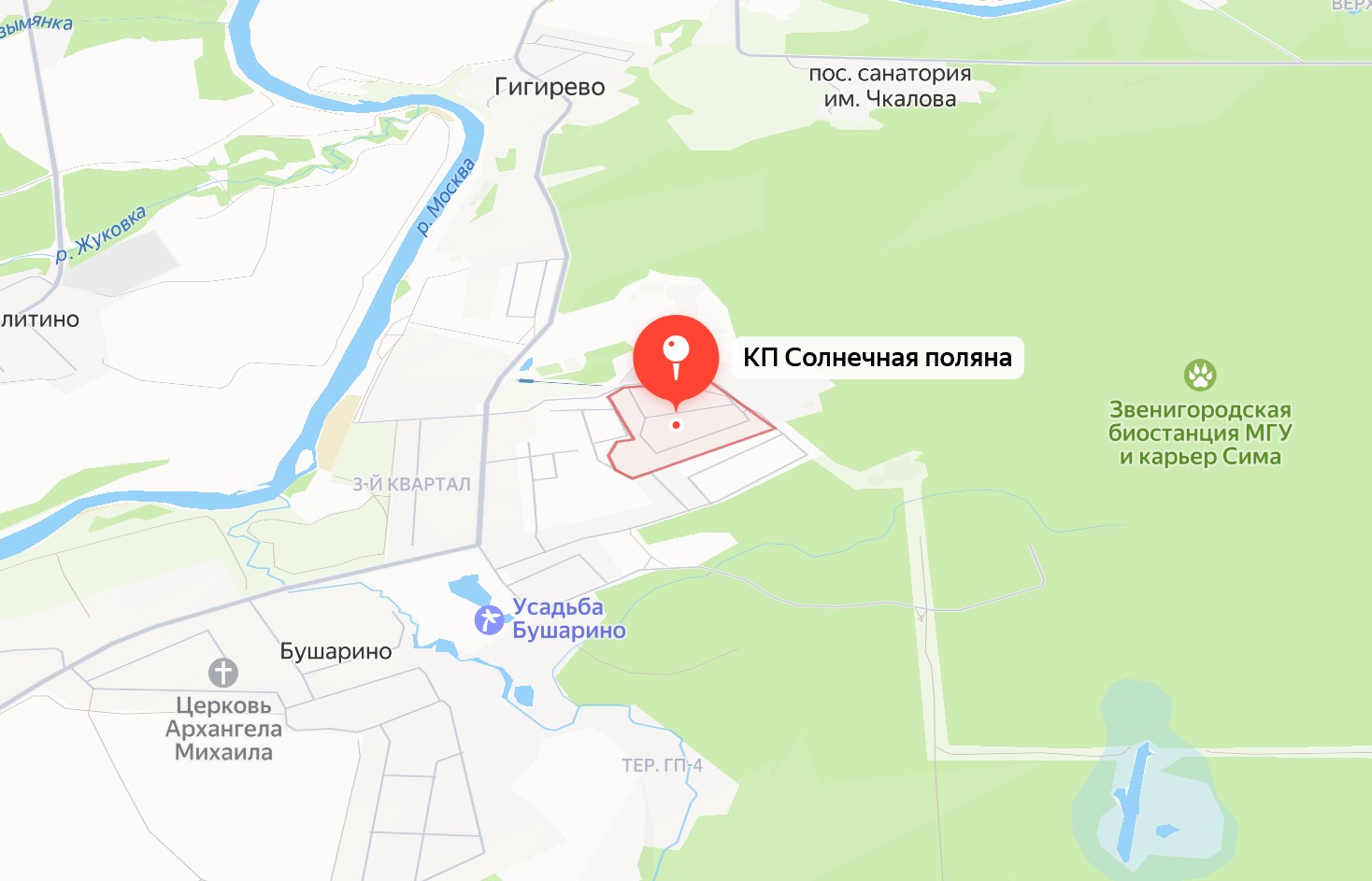 Коттеджный поселок «Солнечная поляна» расположен в престижном Одинцовский районе Московской области - «Московской Швейцарии», в 16 км от г. Звенигорода - подмосковной здравницы, где расположены десятки домов отдыха, санаториев, пансионатов.