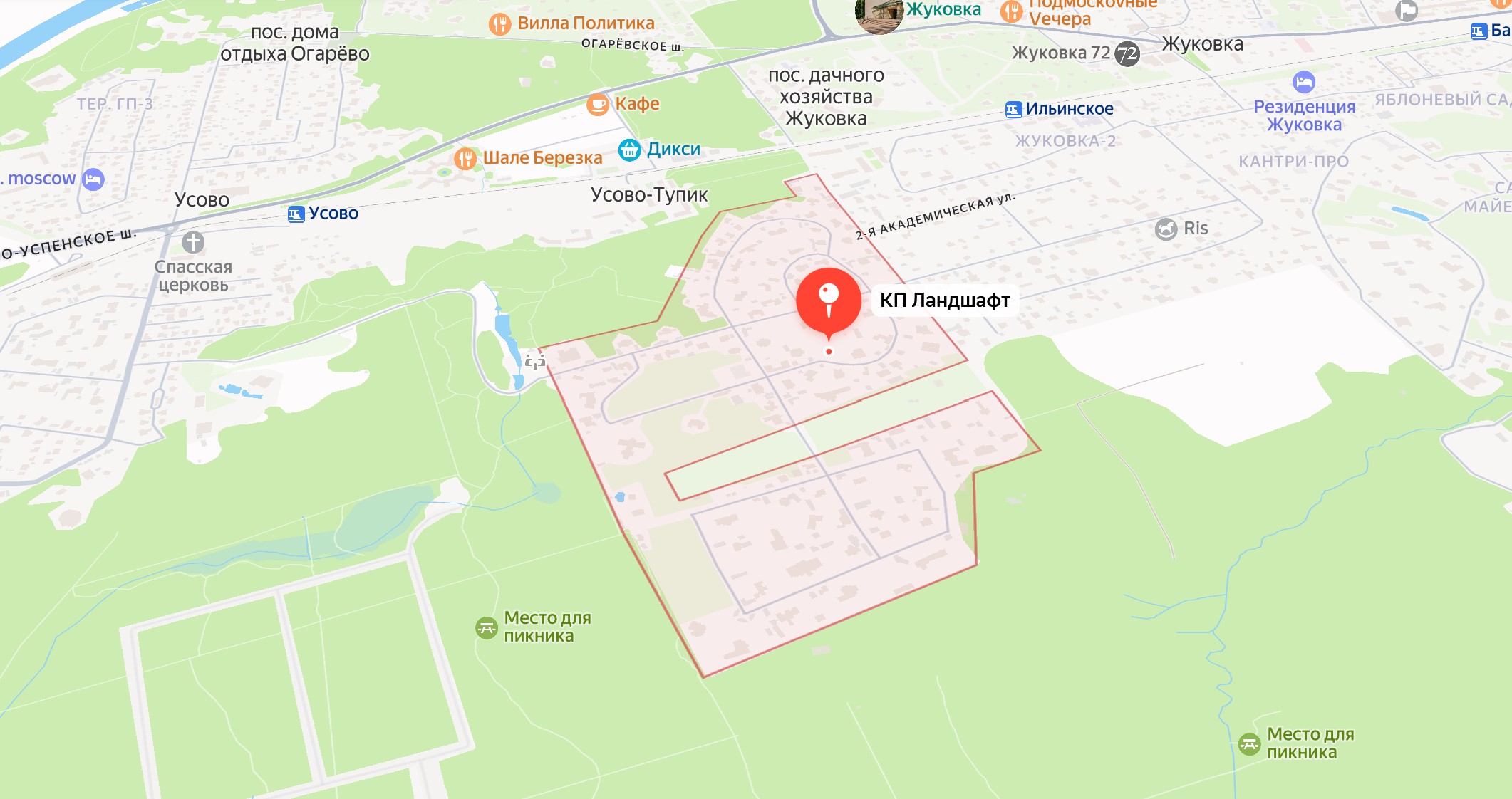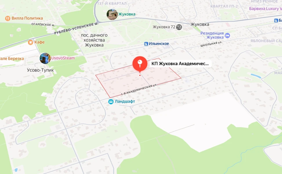 «Жуковка Академическая» находится в самом центре деревни Жуковка и граничит с посёлком «Ландшафт», ЛОК УПДП «Жуковка-2» и поселком «Жуковка-3». Буквально в пешей доступности от поселка расположена богатая инфраструктура Рублево-Успенского шоссе, полностью адаптированная для полноценного проживания загородом. Именно поэтому это место так любят знатоки и ценители рублевской жизни.
