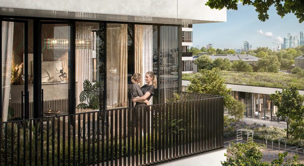 Внутренний двор жилого квартала будет оформлен как ландшафтный парк, а у резидентов будет возможность высадить деревья в кадках на собственных лоджиях. Именно зеленые кроны деревьев на фоне инновационных фасадов башен станут одной из знаковых архитектурных черт этого квартала, воплощающих принципиально новый образ городской жизни.