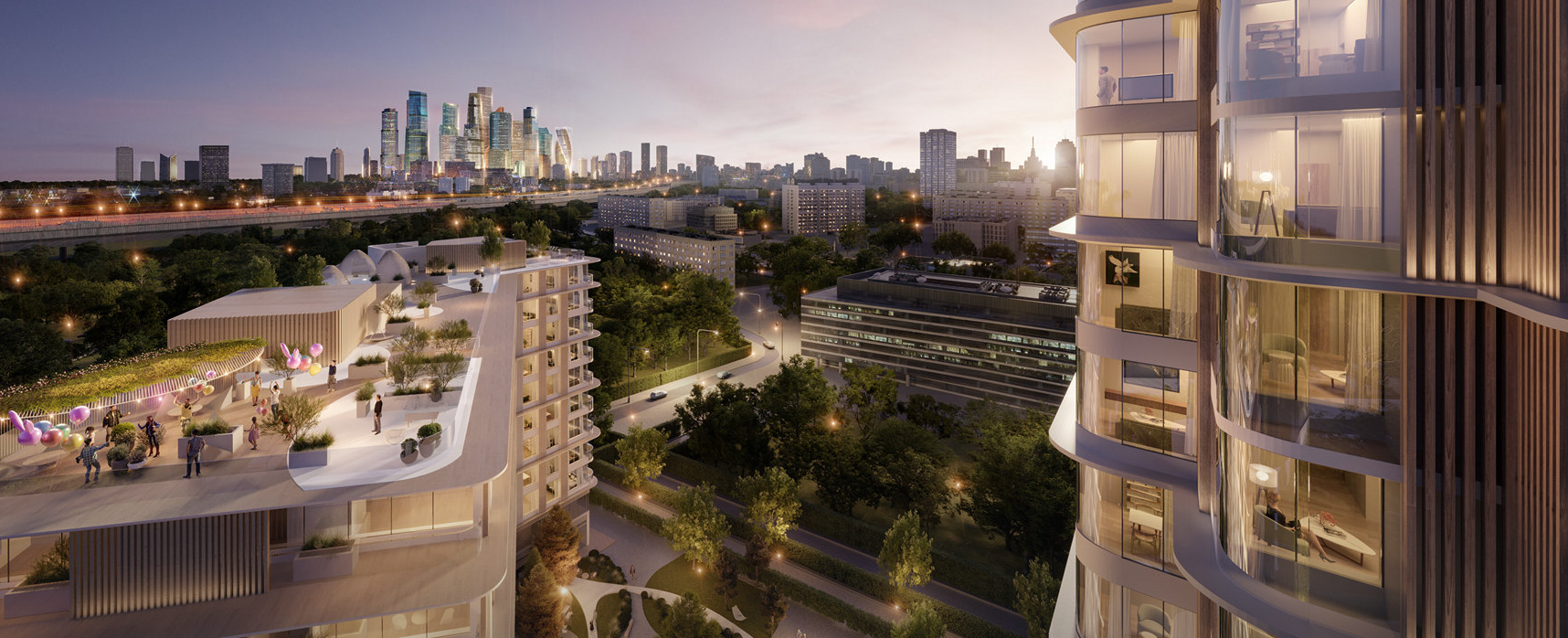 Клубный дом бизнес-класса с опциями премиум в Раменках. Закрытый внутренний двор, эксплуатируемая крыша, квартиры с террасами, концепция Live & Work. Архитектурный проект японского бюро Nikken Sekkei.