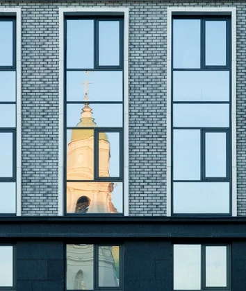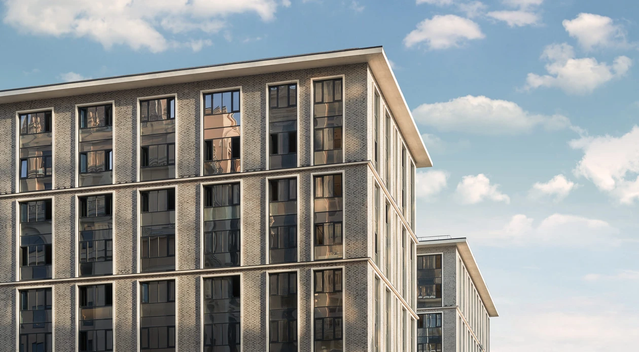 Архитектурное бюро «СПИЧ» гармонично вписало неоклассический стиль в современный мегаполис. Благодаря эффектным окнам в пол кажется, что здание обрамляют колонны. Выступающие эркеры добавляют изысканности.
