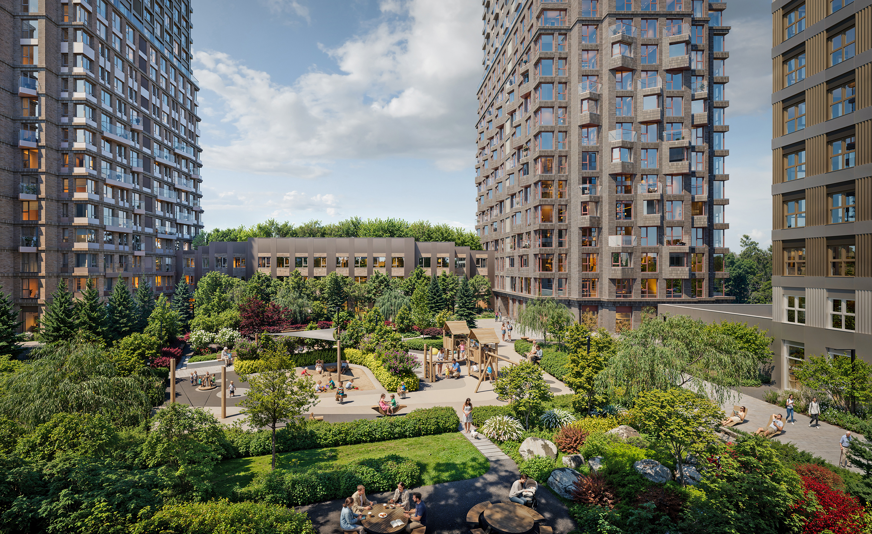 Мы создаем многофункциональный район с уникальной идентичностью, интегрированный в городскую ткань Москвы. Ключевой принцип — комплексное развитие территории, учитывающее потребности всех групп пользователей: от жителей и бизнеса до гостей города. Проект максимально раскрывает потенциал места за счет синтеза современной архитектуры, динамичной деловой среды и уникального природного ландшафта — акватории Москвы-реки и зеленых массивов.