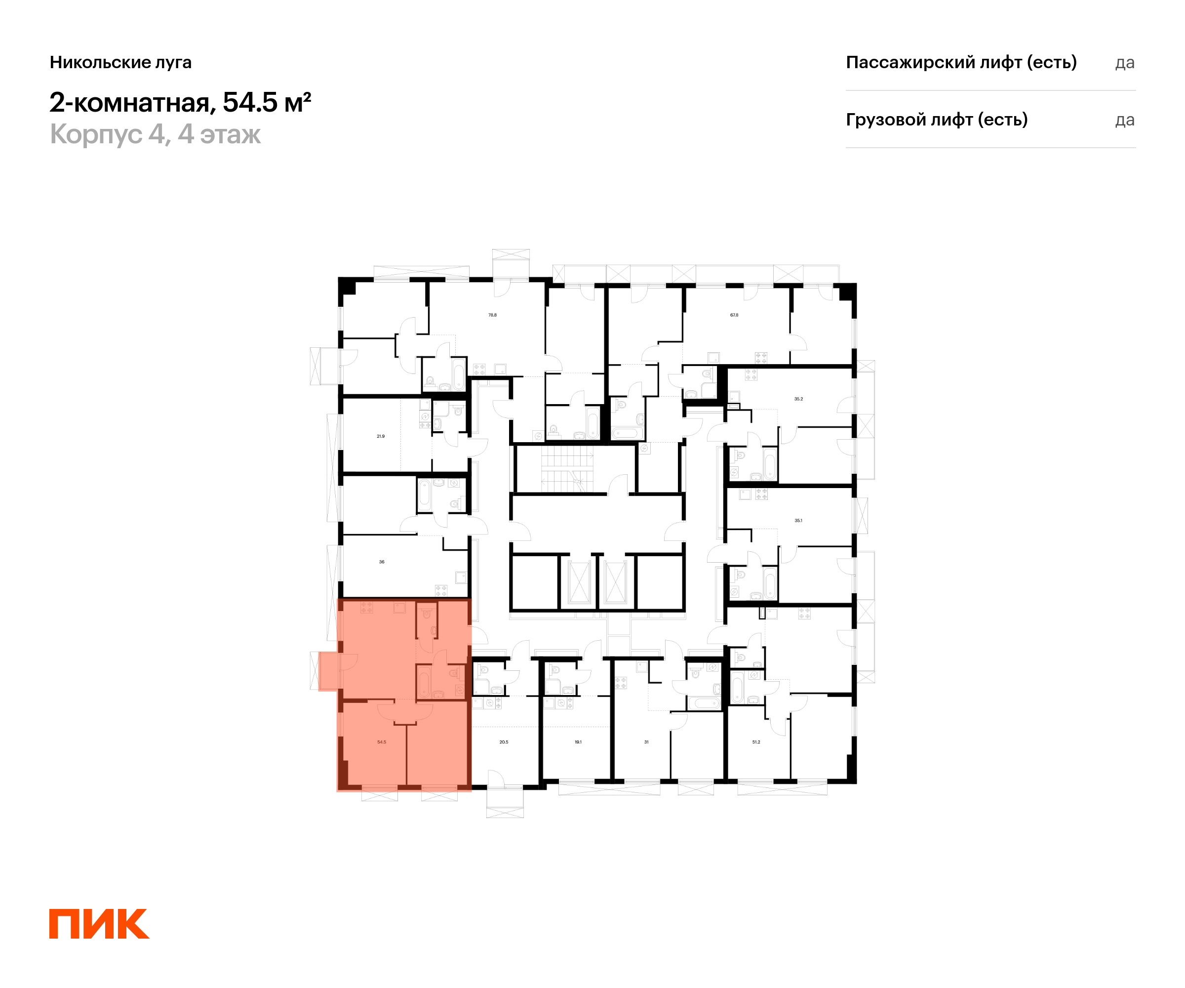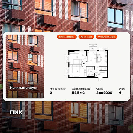 Продаётся 2-комн.квартира площадью 54.50 кв.м на 4 этаже 17 этажного дома (Корпус 4, секция 3) проекта ПИК Никольские луга. Светлый просторный подъезд на уровне земли, функциональная планировка, большие окна, с отделкой.