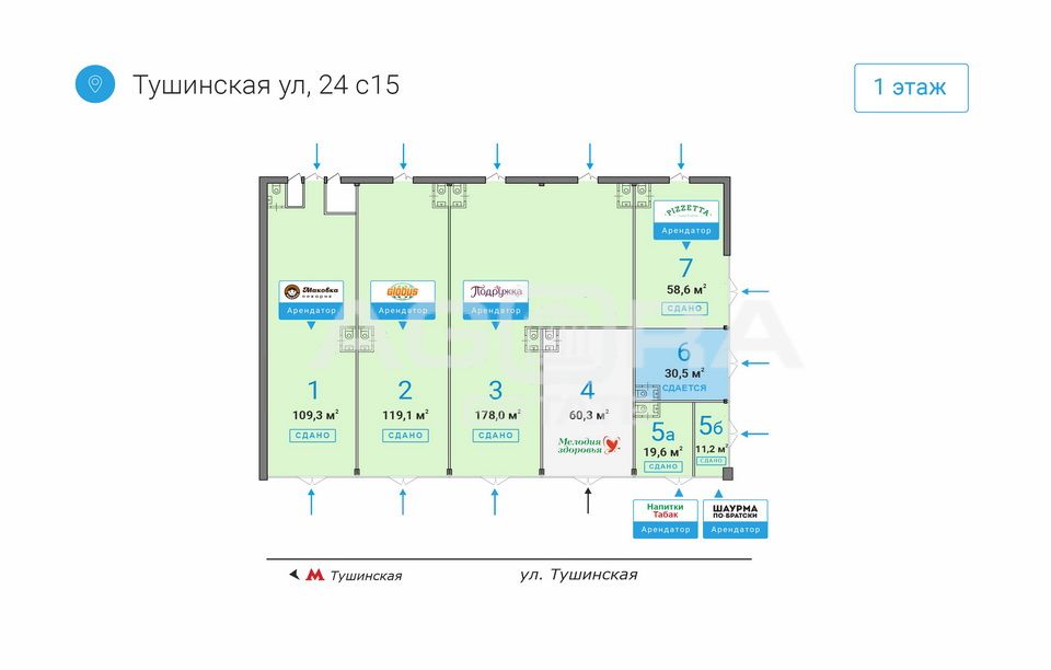 Продажа торгового помещения на выходе из метро Тушинская. Арендный бизнес с сетевым арендатором! Первая фасадная линия!!! 1 мин. от м. Тушинская. Помещение площадью 11,2 кв.м (на плане № 5б), расположено на 1-м этаже административного здания 1988 года постройки. Отдельный вход с фасада, витрина. Все городские инженерные коммуникации, санузел, отдельные приборы учета электричества. Огромная проходимость, отличное торговое окружение и визуализация. Объект № 549768Номер объекта: #5/549768/310