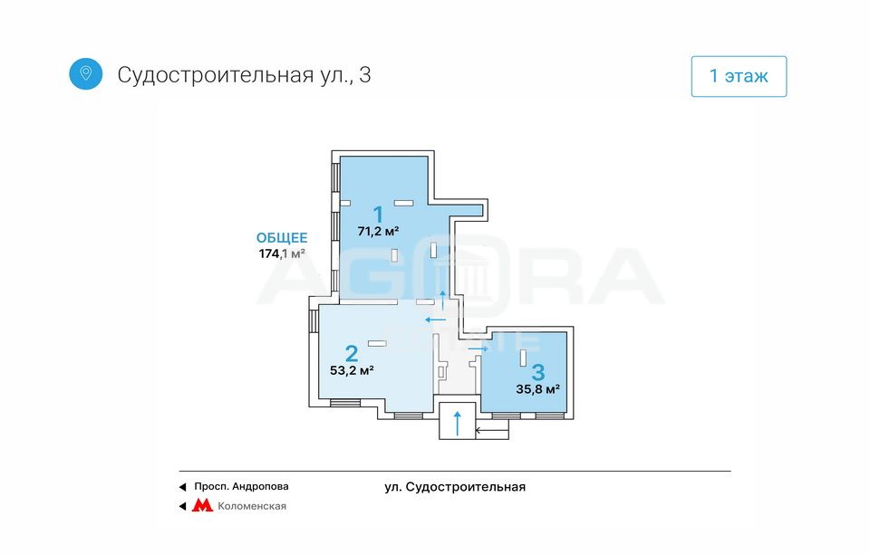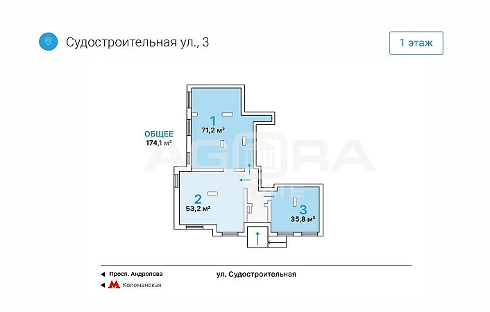300 метров от метро Коломенская. Аренда помещения свободного назначения. Помещение площадью 71,2 кв.м (блок № 1 на плане) расположено на 1-м этаже 16-ти этажного жилого дома, зальная планировка, высота потолков 3,5 м, витрины, возможна наружная реклама на фасаде. Помещение подготовлено под чистовую отделку. Общая входная группа. Коммунальные платежи и электричество оплачиваются арендатором отдельно. Отлично подойдёт под любой вид деятельности - торговое помещение, магазин, ресторан, кафе, аптека, салон красоты, банк, офис продаж, кофейня и др. Интенсивный пешеходный трафик. Помещение расположено в крупном сложившемся жилом районе с высокой плотностью застройки и развитой инфраструктурой. В окружении находятся торговые центры «Коломенский», «Место встречи Орбита», бизнес-центр «Нагатинский», музей-заповедник «Коломенское». Объект № 549812Номер объекта: #5/549812/310