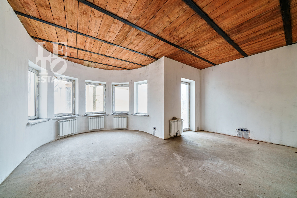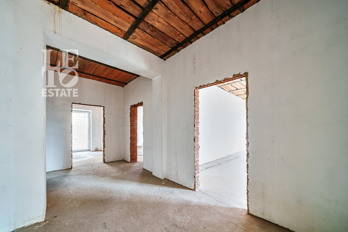 Планировка включает огромную кухню-столовую, большую гостиную с выходом на террасу и шесть спален, СПА-комплекс в цокольном этаже. Выполнена частичная черновая отделка: стены оштукатурены и подготовлены под покраску, разведено электричество, водопровод, канализация, отопление, установлены радиаторы отопления. Также выполнена чистовая отделка котельной и мансардного этажа.