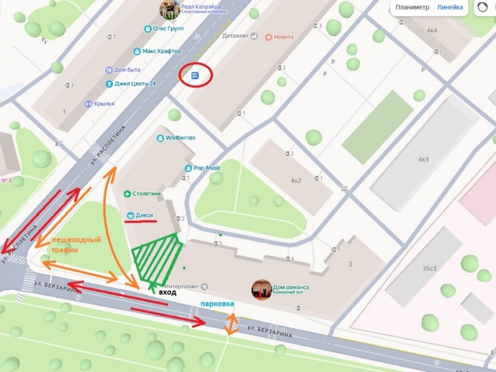 . В окружении несколько учреждений с ежедневным потоком посетителей в течение дня, что обеспечивает устойчивый трафик в течение дня.
