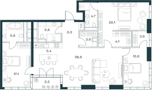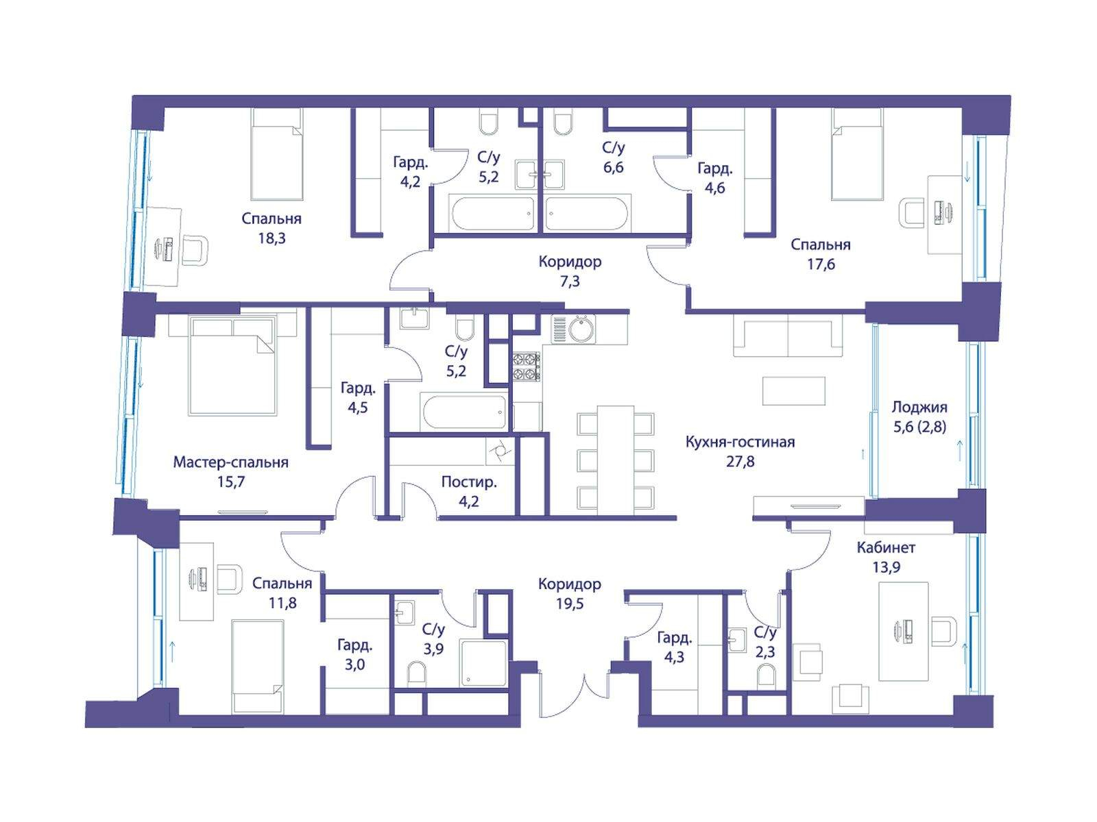 В квартире продуманная функциональная планировка с просторной кухней 27.80 м2. Жилая площадь - 77.30 м2. Высота потолка от 3,65 м. Изолированные комнаты, 5 санузлов(1 раздельный и 4 совмещенных) . Окна на смежные стороны. Виды на природный парк и реку.