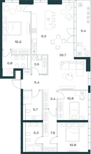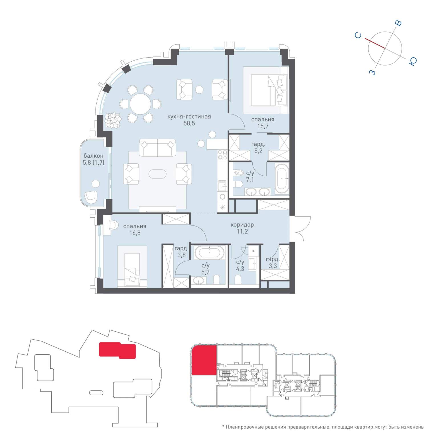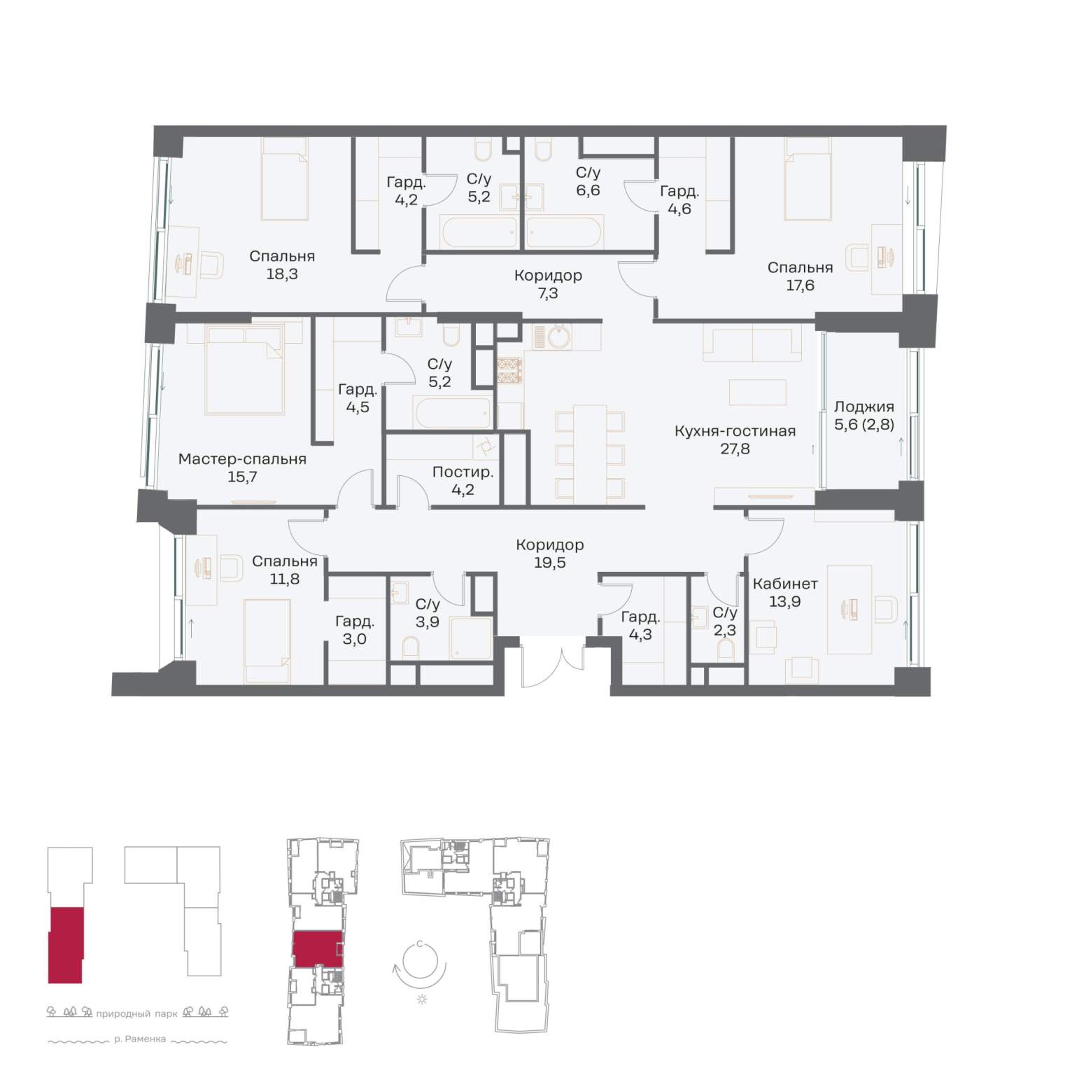 Продается просторная квартира площадью 182.70 м2 в жилом комплексе РЕКА. Квартира находится в 1 секции корпуса 3 (будет введен в эксплуатацию в 4 кв. 2026) . Этаж 11-й из 16.