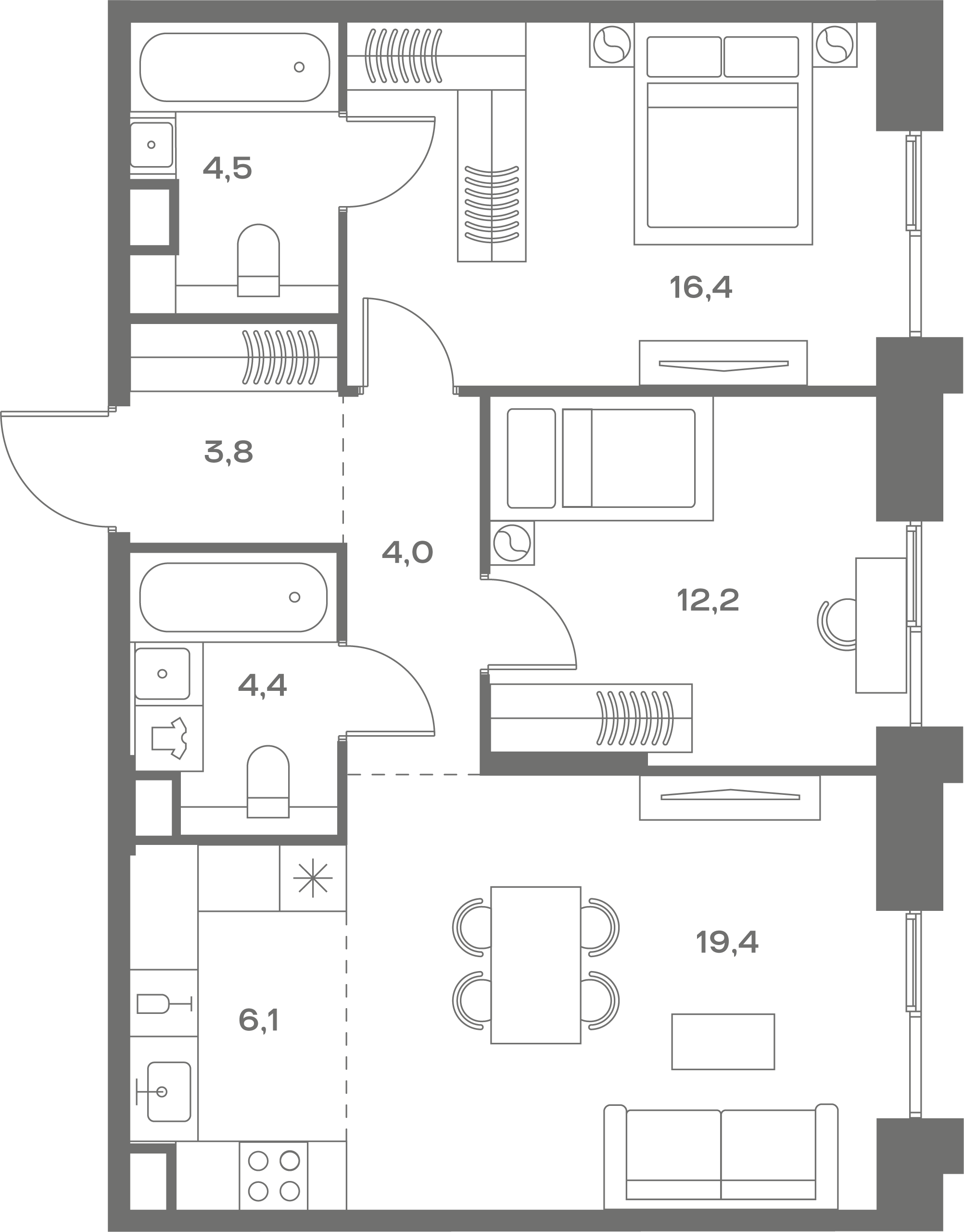 • Высокие потолки: в квартирах – 3.1 м, в пентхаусах – 3,7 м