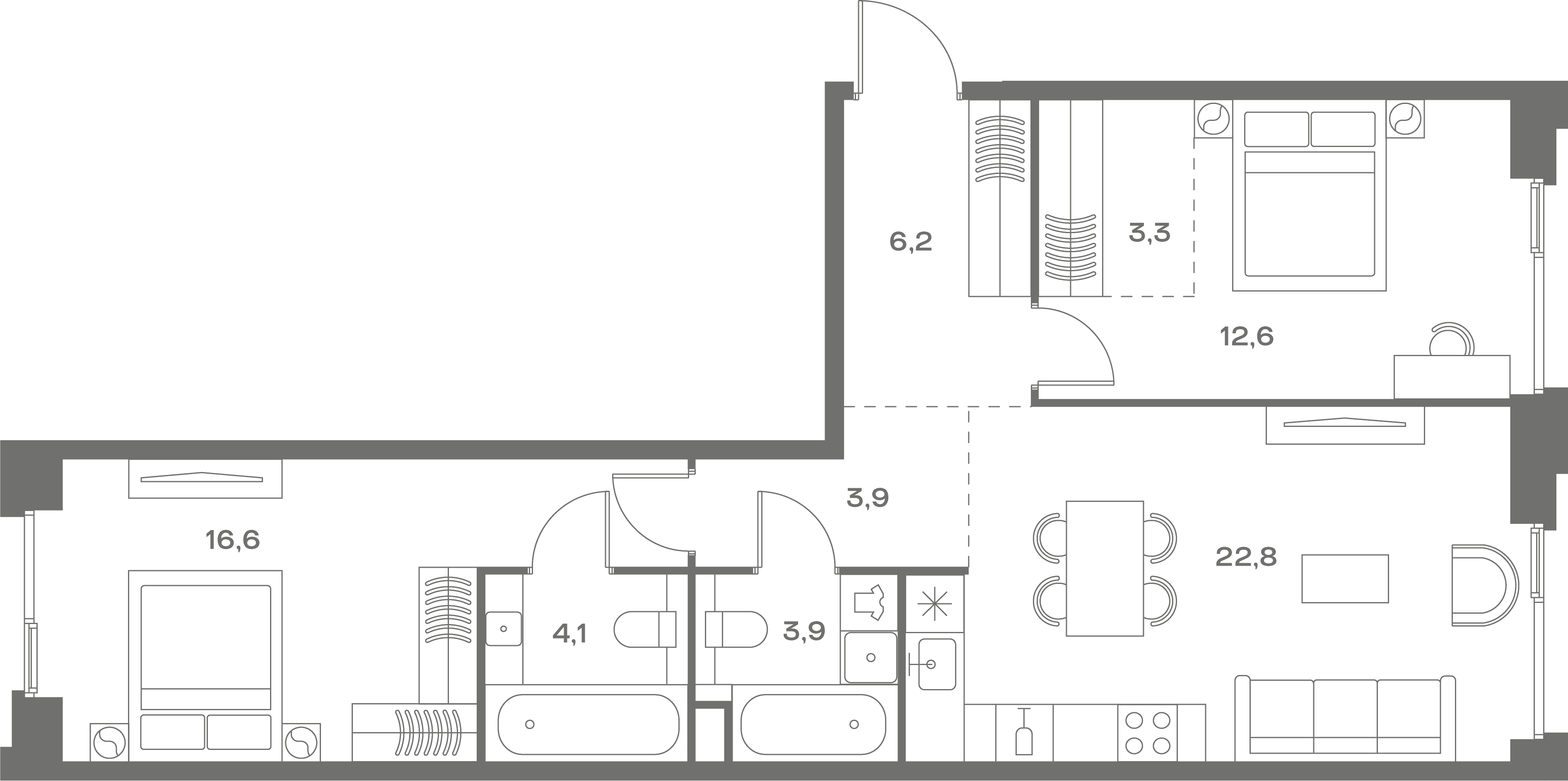 • Высокие потолки: в квартирах – 3.1 м, в пентхаусах – 3,7 м