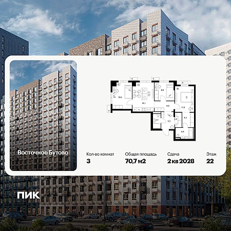 Продается 3-комн. квартира, площадью 50.42 м2 в монолитной новостройке в 5 мин. транспортом от м. Аникеевка.