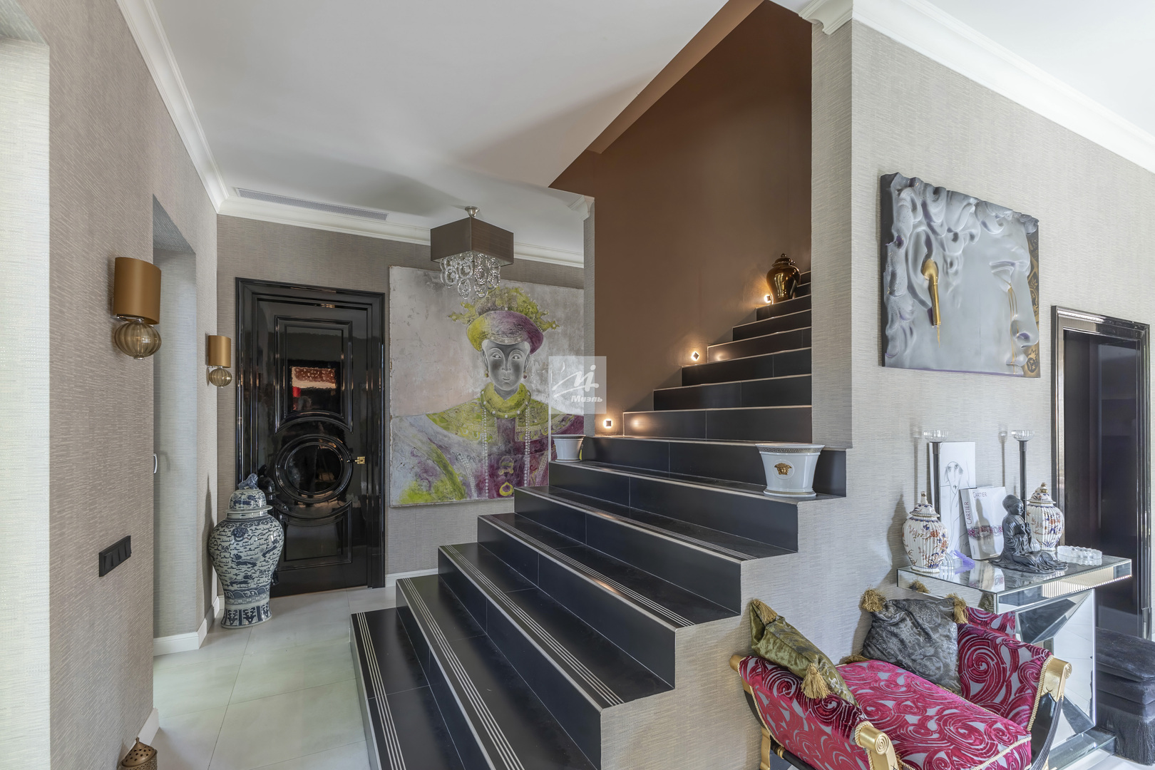 Широкая лестница ведет на второй этаж, где располагаются 4 спальни, 3 санузла. В одной из спален дополнительно установлена ванна. Окна в пол обеспечивают достаточный приток естественного освещения во все комнаты в доме, включая холл. Небольшая часть мебели остается.