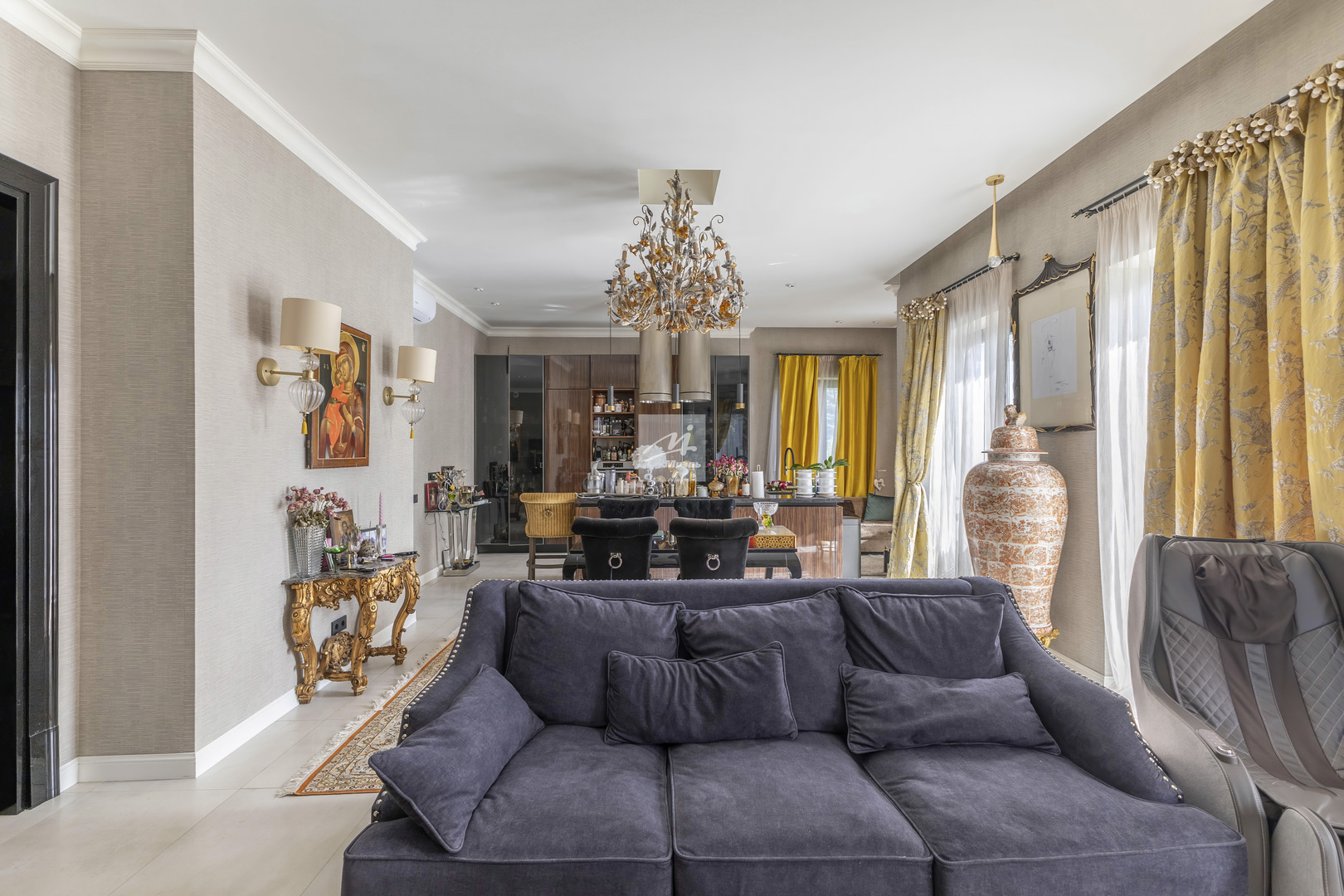 На первом этаже: просторный холл, 1 санузел, небольшая открытая гардеробная в под лестничном пространстве, зона кухни с большим островом, объединенная с гостиной, закрытая большая гардеробная комната и бойлерная. Из гостиной есть 2 выхода на зеленую лужайку перед домом, что в летнее время очень удобно и востребовано.