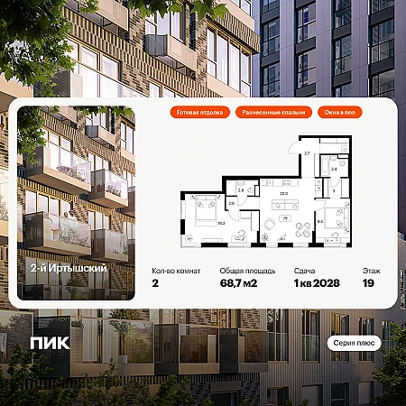 Продаётся 2-комн.квартира площадью 68.70 кв.м на 19 этаже 20 этажного дома (Корпус 1.7, секция 7) проекта ПИК 2-й Иртышский. Светлый просторный подъезд на уровне земли, функциональная планировка, большие окна, с отделкой.