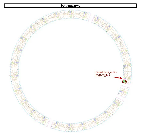 Знаменитый "Дом-бублик" на Нежинской улице. Архитектор Евгением Стамо и инженером Александром Маркеловым. Жители этого дома могут теоретически удовлетворить все свои потребности, так как в здании есть магазины, аптеки, швейная мастерская, салон красоты и прочее. Двор дома может сравниться по размеру с футбольным полем. Помещение 19,4 метра - 2 этаж.
