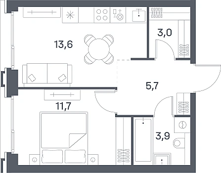Жилая площадь - 33,9 кв.м.