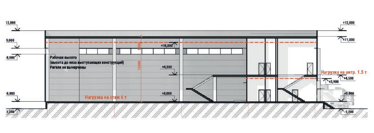 Нагрузка на пол: 6 тонн/м², в зоне мезонина: 1,5 т/м².