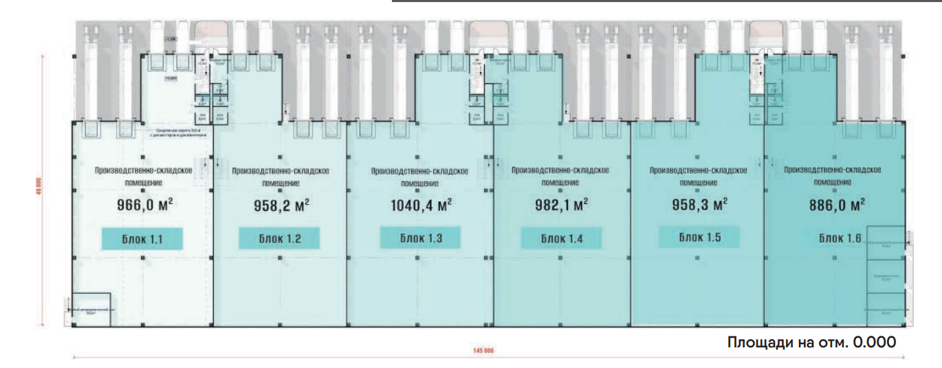 Площадь первого этажа 978.5 м2, площадь антресоли 425.9 м2.(есть разные варианты меньше и больше).