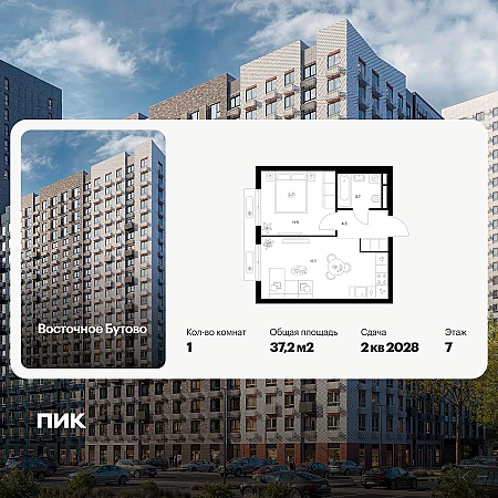 Продаётся 1-комн.квартира площадью 37.20 кв.м на 7 этаже 25 этажного дома (Корпус 55, секция 1) проекта ПИК Восточное Бутово. Светлый просторный подъезд на уровне земли, функциональная планировка, большие окна, с отделкой.