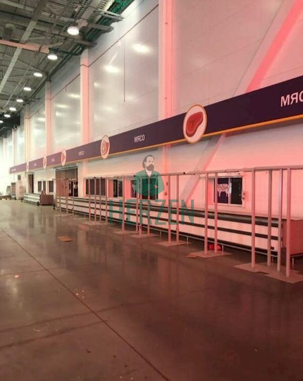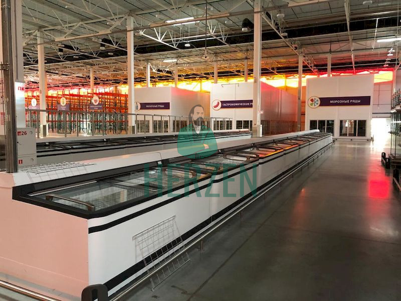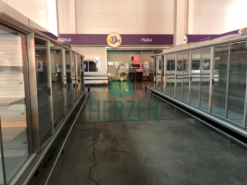 В торговом зале зал расположены входная, кассовая и торговая зона, а также три холодильные камеры площадью 420 м²: две среднего холода (+2+4С) и одна низкого холода -18-22С.