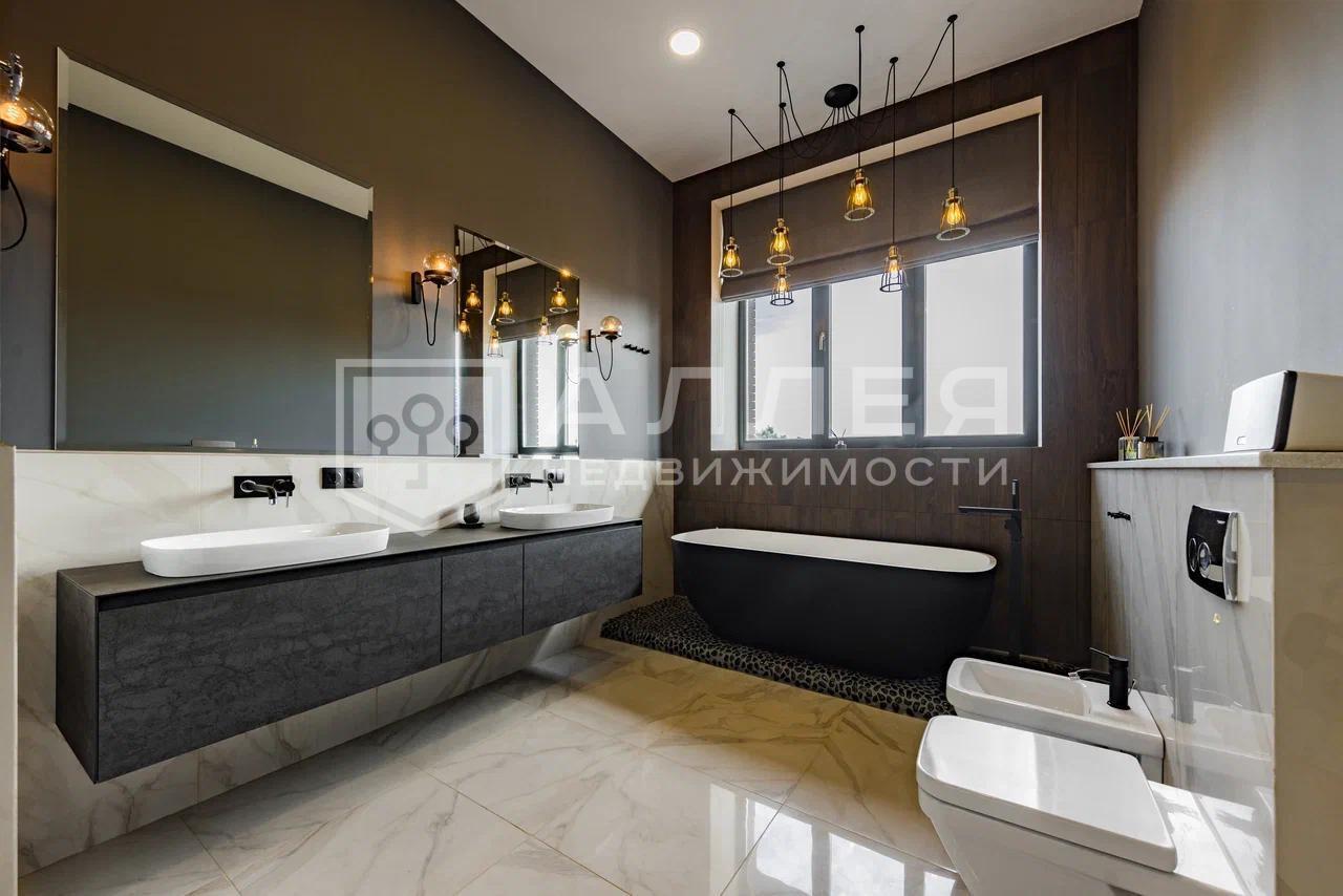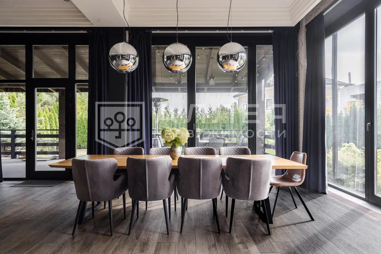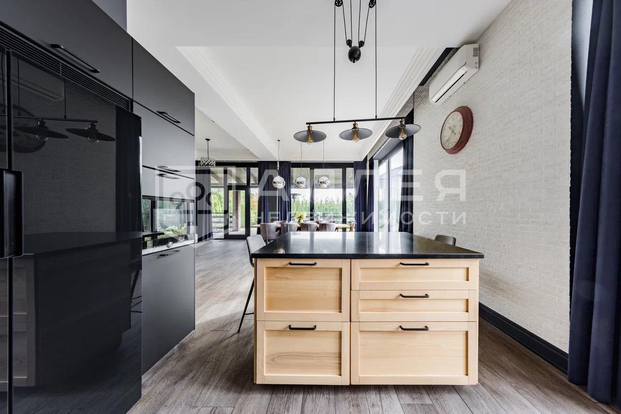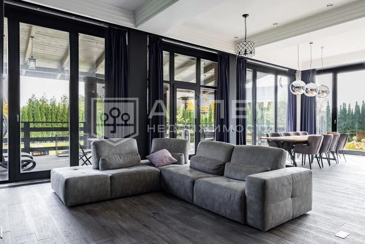 Загородный дом площадью 440 м2 в престижном коттеджном посёлке на Новой Риге. Дом просторный, - включает в себя 6 спален, рабочий кабинет, кинотеатр, сауну и уютную зону гостиной с современной кухней и зоной столовой с панорамным остеклением. Дом меблирован качественной мебелью от брендовых производителей.