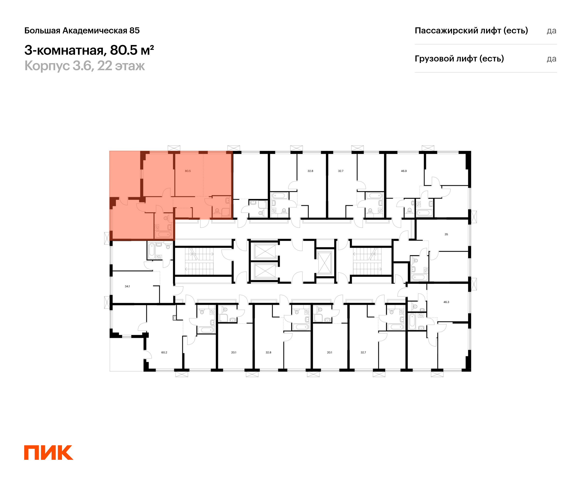 Продаётся 3-комн.апартамент площадью 80.50 кв.м на 22 этаже 24 этажного дома (Корпус 3.6, секция 2) проекта ПИК Большая Академическая 85. Светлый просторный подъезд на уровне земли, функциональная планировка, большие окна, с отделкой.