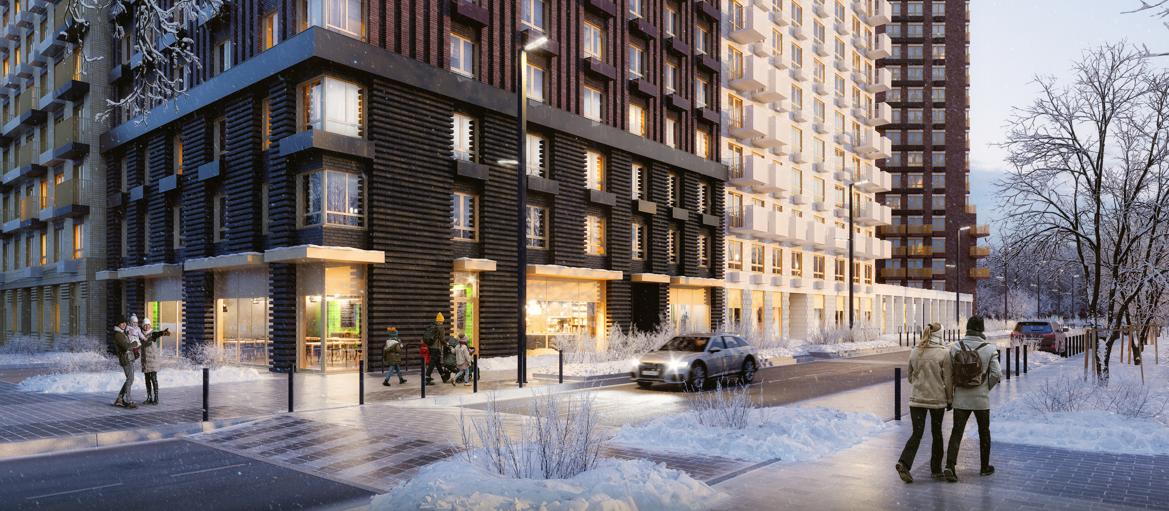 В домах просторные и светлые подъезды без ступеней и пандусов, с выходами во двор и на улицу. На первых этажах домов — магазины и кафе. Для владельцев автомобилей предусмотрен подземный паркинг, а для самых маленьких жителей — собственный детский сад, который объединён с начальной школой.