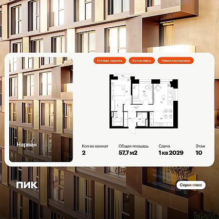 Продаётся 2-комн.квартира площадью 57.70 кв.м на 10 этаже 19 этажного дома (Корпус 1.2, секция 2) проекта ПИК Нарвин. Светлый просторный подъезд на уровне земли, функциональная планировка, большие окна, с отделкой.