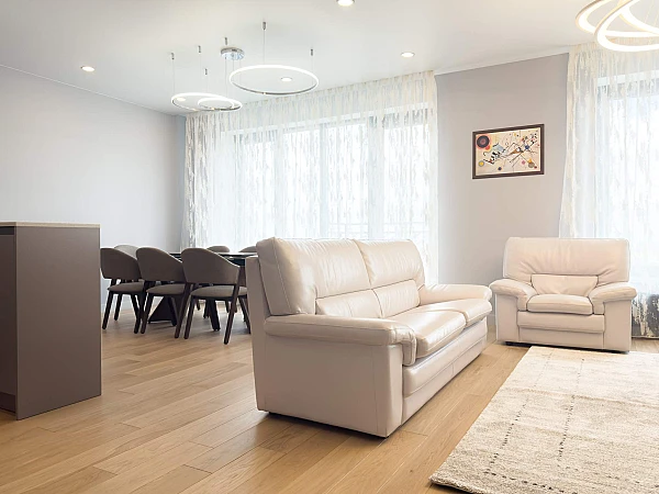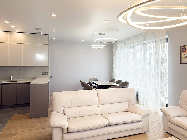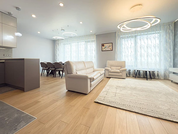 Потолки высотой 3 метра дарят ощущение свободы и объема, а панорамные окна открывают живописный вид на зелень и город.