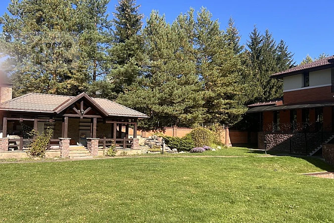 На участке выполнен ландшафтный дизайн, видеонаблюдение по периметру, беседка с мангальной зоной и печью, пруд, отдельный дом для персонала/охраны.