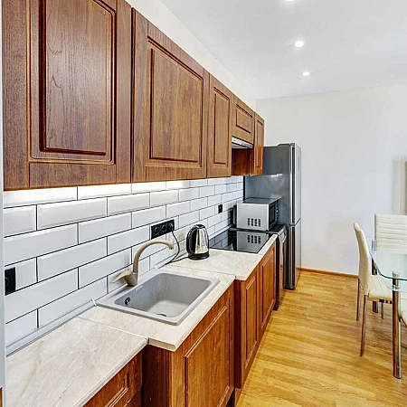 Полностью оборудованная кухня: холодильник, стиральная машина, посудомоечная машина, варочная панель, духовой шкаф и микроволновая печь – готовьте с удовольствием!