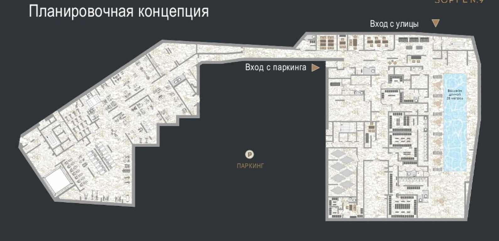 ==ЛОТ 222078 == ОТ СОБСТВЕННИКА, БЕЗ КОМИССИИ. Предлагается в аренду помещение для размещения фитнес-клуба с бассейном в жилом комплексе Зорге 9, расположенном в престижном районе Ходынка в Москве. Этот район славится своей развитой инфраструктурой и находится в непосредственной близости от станции метро Хорошёво, всего 7 минут пешком. В жк Зорге 9 проживает более 5000 жителей, что создает отличный поток клиентов для вашего бизнеса. Общая площадь- 2575, 6 кв. м, расположено на -1 этаже с высотой потолка- 4, 8 м. Планировка свободная, а готовый дизайн-проект с рабочей документацией позволит вам оперативно приступить к реализации задуманного. Также стоит отметить, что у помещения есть три входные группы, свой отдельный вход с улицы и с паркинга. Электрическая мощность- 350 кВт. Чаша бассейна на 3 дорожки длиной 25 метров.