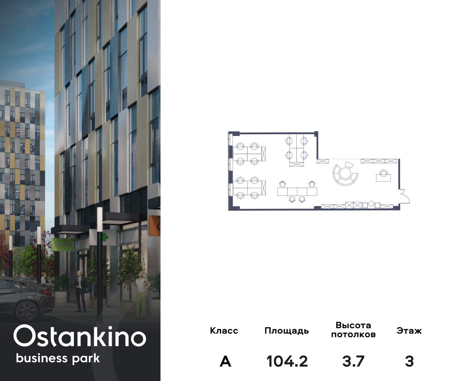 Основные характеристики помещения: панорамные окна, высота потолков 3,2 м, центральная система вентиляции и кондиционирования, круглосуточная охрана, видеонаблюдение, система контроля доступа.