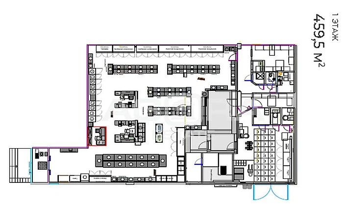 Помещение общей площадью 426,3 кв.м расположено на 1-м этаже одноэтажного здания, находящегося в центре жилого массива. Зальная планировка, потолки 3,6 м, большие витрины по фасаду, электрическая мощность 60 кВт. Два отдельных входа с фасада + зона погрузки.