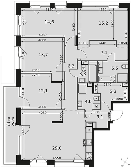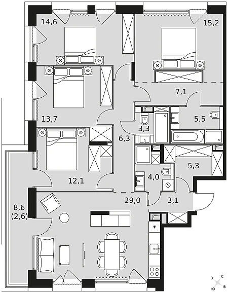 Удобная распашная планировка с идеально проработанной эргономикой пространства: просторная кухня-гостиная 34,6 м2, две изолированные спальни 21/16,1 м2 со своими гардеробными 6,5/3,7 м2 , вместительная прихожая 10,5 м2, гардеробная для верхней одежды 3,5 м2, два с/у 7/2,5 м2, коридор 7,1 м2 и кабинет 6,6 м2 с прекрасным видом на исторический Посёлок художников и улицу Врубеля. В квартире грамотно поделено пространство на приватную и общественную зоны.