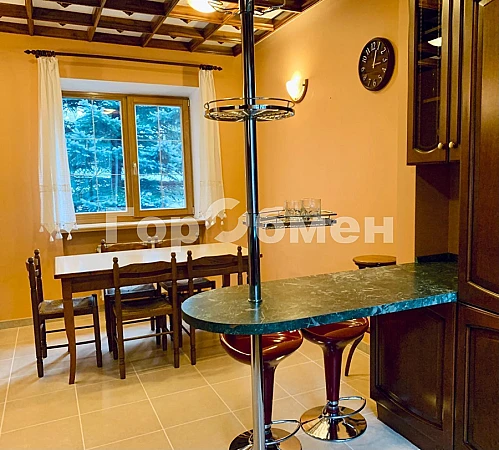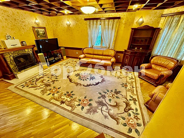 Цокольный этаж: зона отдыха, дровяной камин, комфортная мягкая мебель, бассейн с подсветкой и автоматической системой очистки воды, кресло массажное, сауна, душевая кабина, санузел. Вспомогательные помещения: постирочная, кладовая.