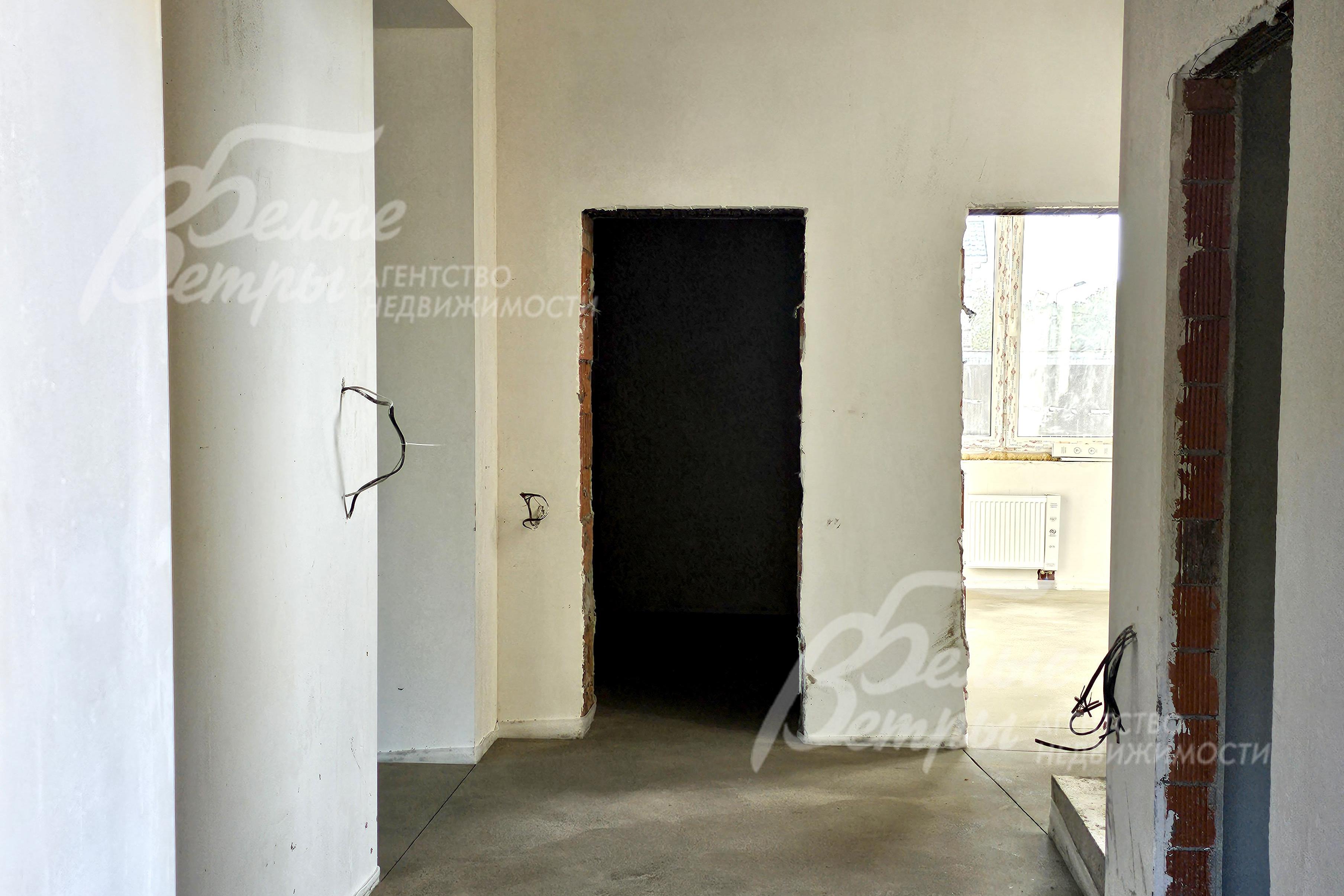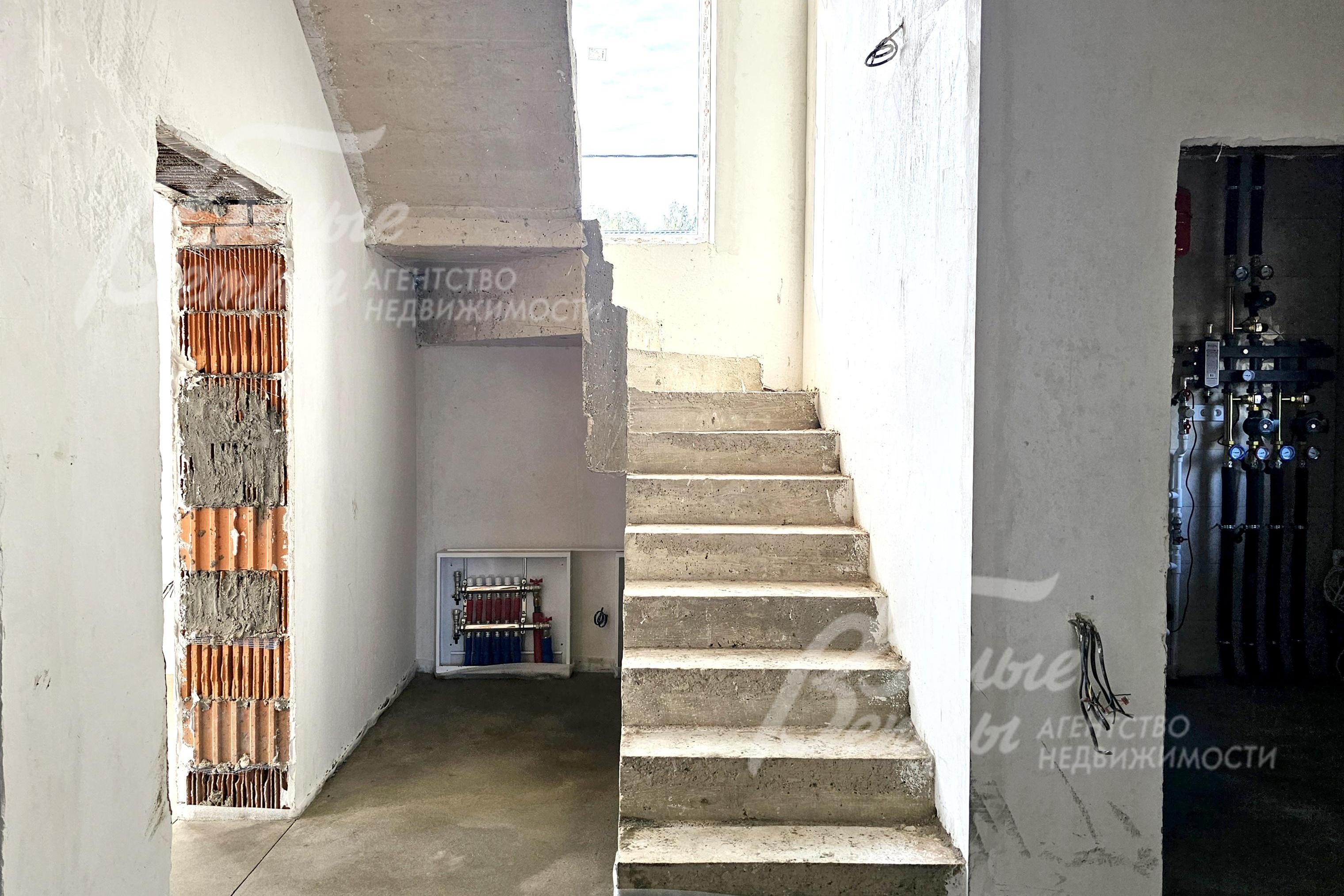 Внутренняя отделка: дом – под чистовую отделку. Стены оштукатурены и зашпаклёваны, выполнена стяжка пола (на 1-м этаже и в санузлах 2-го этажа – тёплые полы), потолки – монолитные (между вторым этажом и чердаком – дерево), установлены стальные панельные радиаторы, сделаны выводы под сантехнику, смонтирована монолитная бетонная лестница.